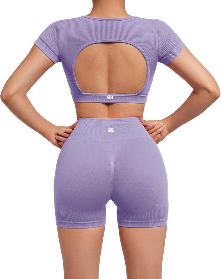 ชุดเล่นกีฬา2ชิ้นบรา2ชิ้นเอวสูงและกางเกงขี่จักรยานไร้ตะเข็บด้านหลังสำหรับออกกำลังกาย