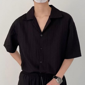 Open Collar Men's Summer Shirt Short Sleeve Pleated Cool V-Neck Top Thin Fabric Toploader