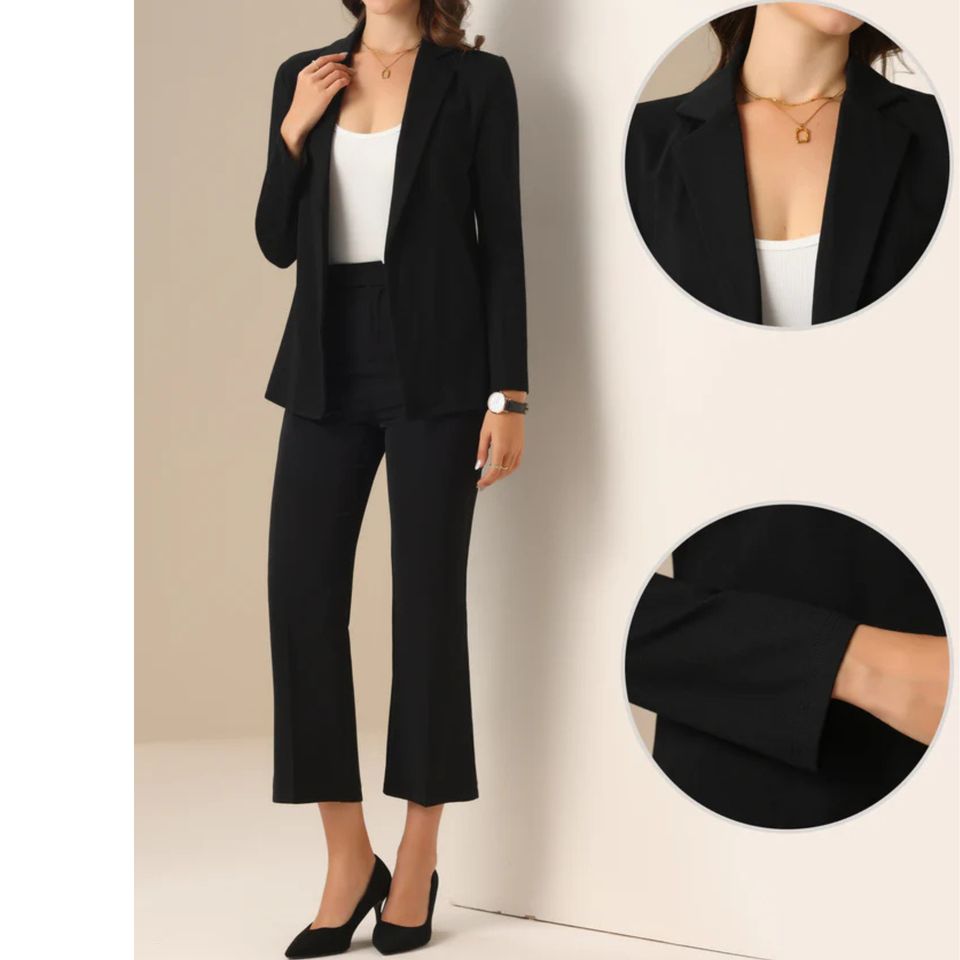 เสื้อเบลเซอร์ผู้หญิงแบบเปิดด้านหน้า คอปกเว้า แขนยาว ลายเรียบ ผ้าทอ ยืดได้ มีกระเป๋า เหมาะสำหรับธุรกิจและการทำงาน