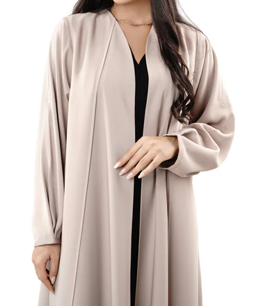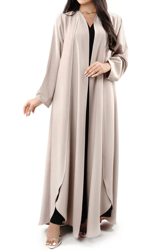 ชุดอาบายาสีน้ำตาลอมเทาเปิดด้านหน้าแต่งชายผ้าและคอวีสวมใส่สุภาพเรียบร้อยสำหรับใส่ในชีวิตประจำวันและสไตล์ทางการได้อย่างง่ายดาย