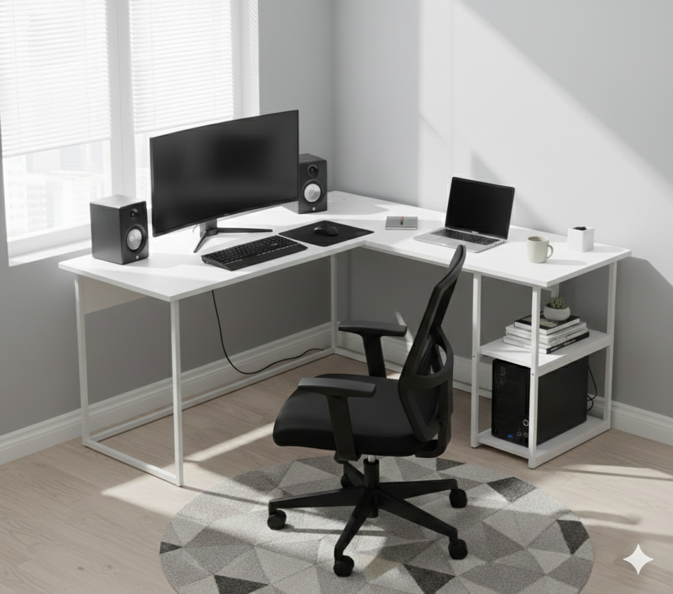 โต๊ะคอมพิวเตอร์รูปตัวแอลแบบปรับเปลี่ยนได้ สำหรับเล่นเกมส์ ทำงานที่บ้าน หรือห้องนอน พร้อมที่วางจอภาพ วัสดุโลหะและไม้ แบบเปิดโล่ง