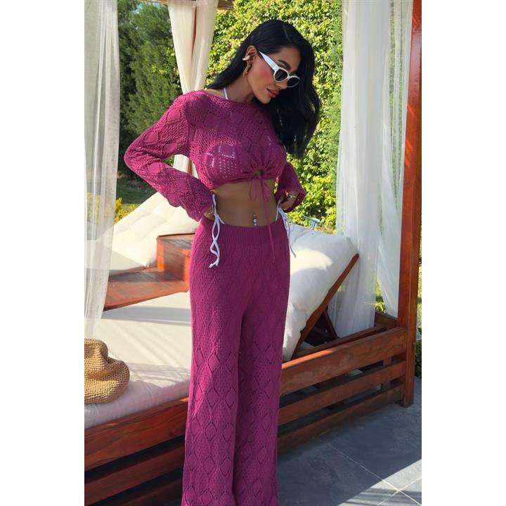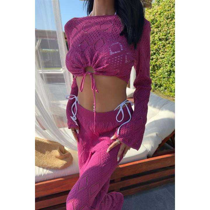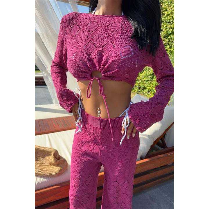 ชุดเสื้อและกางเกงลายฉลุพร้อมดีเทลลูกไม้ที่หน้าอก ชุด 2 ชิ้น สไตล์ 10098