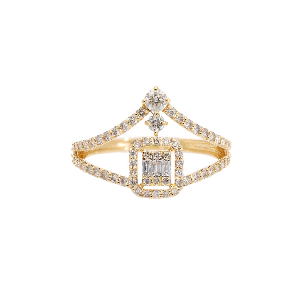 แหวนทอง14K รูปทรงเรขาคณิตลวดลายฉลุพร้อมเพชรบาแกตต์รูปเพชรธรรมชาติที่ไม่เหมือนใคร