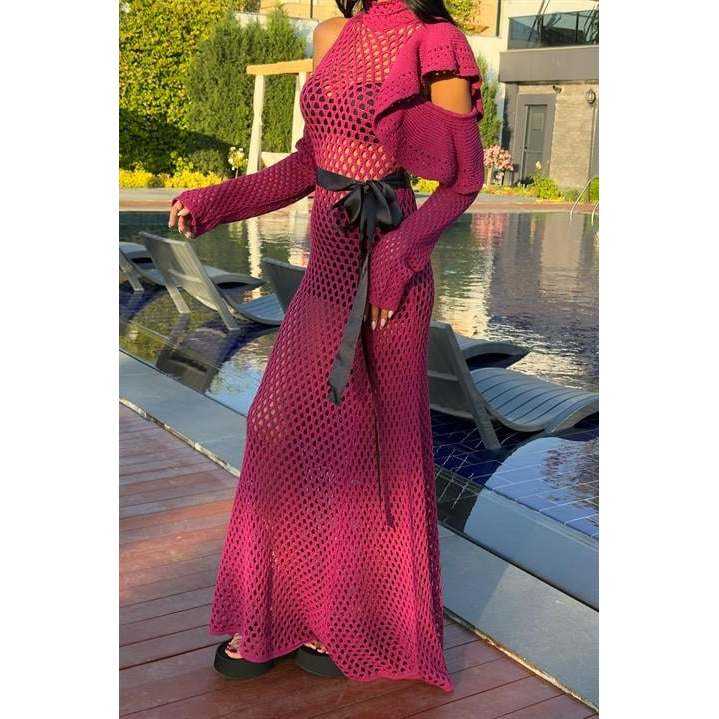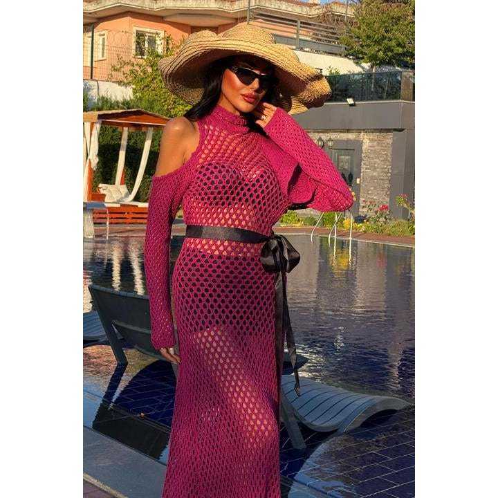 เดรสไหมพรมฉลุลาย 2847 พร้อมเข็มขัดผ้าซาติน ดีไซน์โปร่งแสงและเอวทรงธรรมชาติ