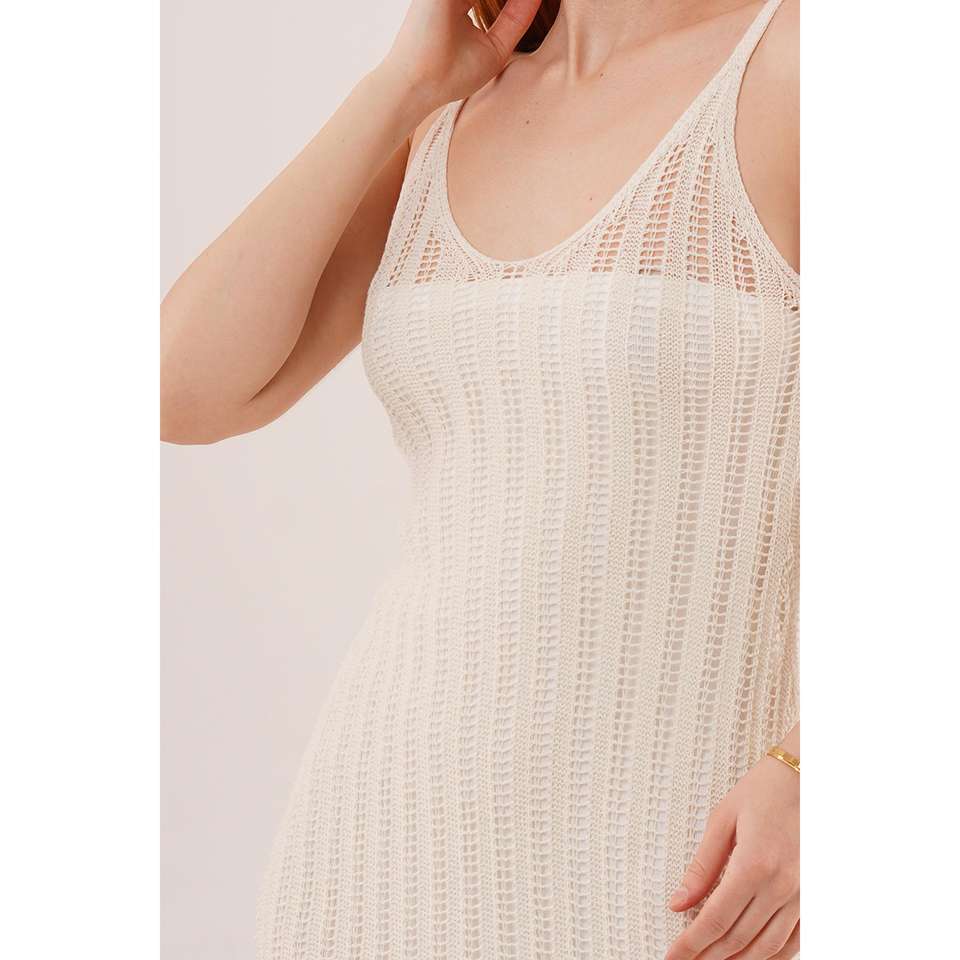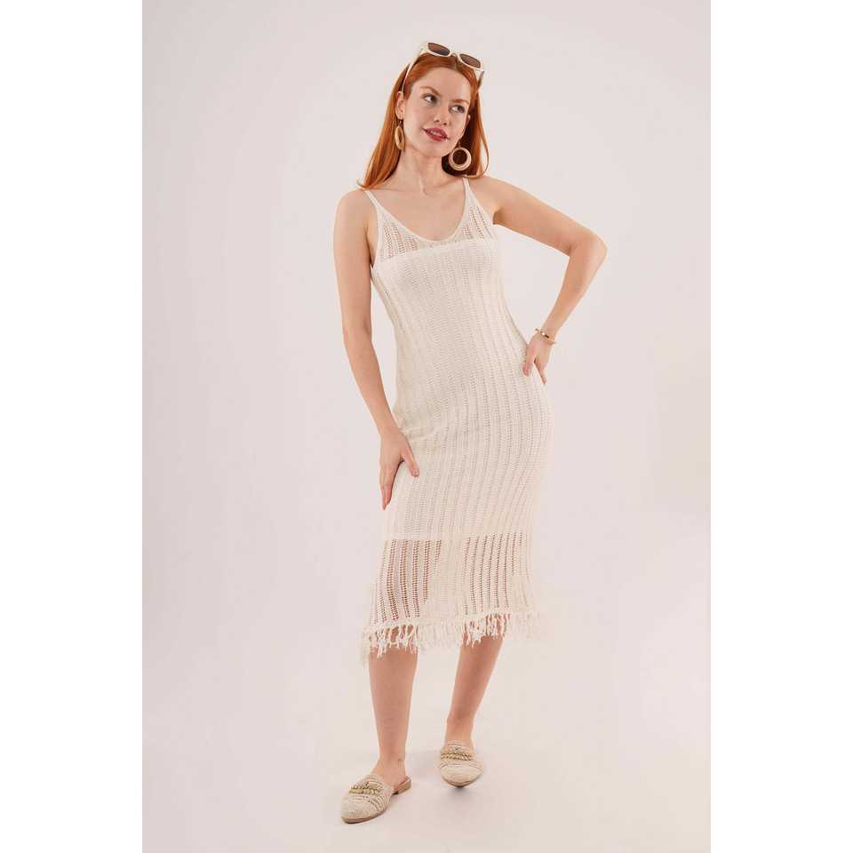 เดรสยาวสีเอครู แต่งพู่ฉลุลาย สายเดี่ยว เปิดหลัง ผ้าถักเนื้อบางเบา สไตล์ลำลอง