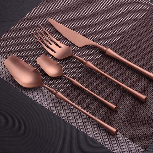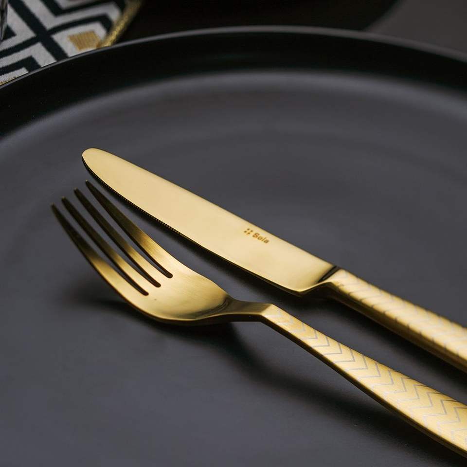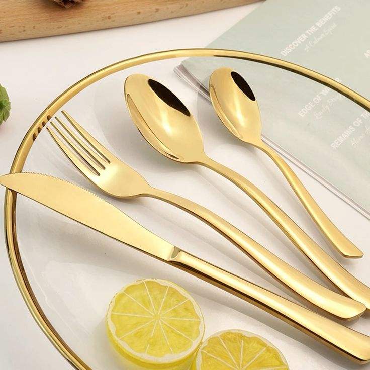 ชุดโต๊ะรับประทานอาหารสีทองหรูหรา พร้อมดีไซน์ด้ามจับที่สวยงาม เหมาะสำหรับการจัดโต๊ะในงานเฉลิมฉลองอันยิ่งใหญ่