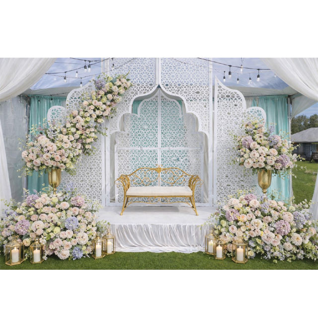 ฉากหลังงานแต่งงานกลางแจ้งสุดหรู ดีไซน์อินเดียโบราณแบบโมกุฎราชวงศ์ ตัดด้วยเลเซอร์ น้ำหนักเบา ทำจากไม้ ผลิตในอินเดีย