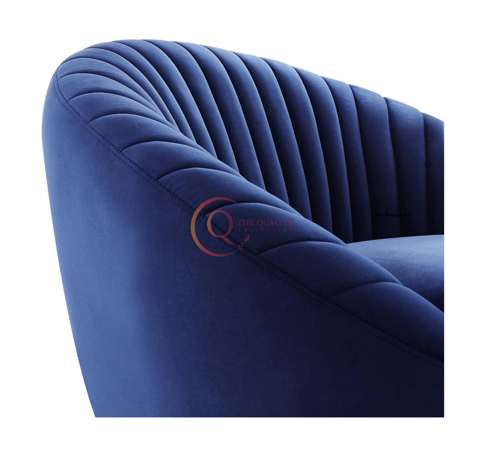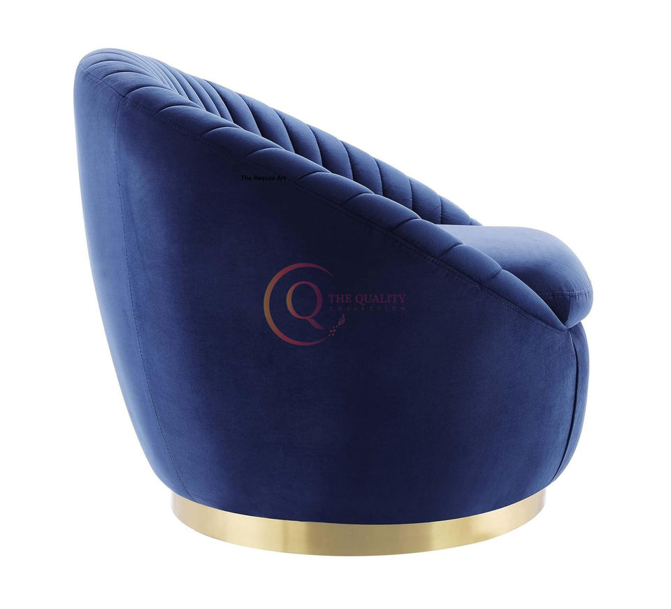 เก้าอี้โซฟากำมะหยี่สีน้ำเงินหรูหราที่มีเปลือกที่ไม่เหมือนใครเช่นพนักพิงและแนวตั้งที่มีฐานสีทองทรงกลม