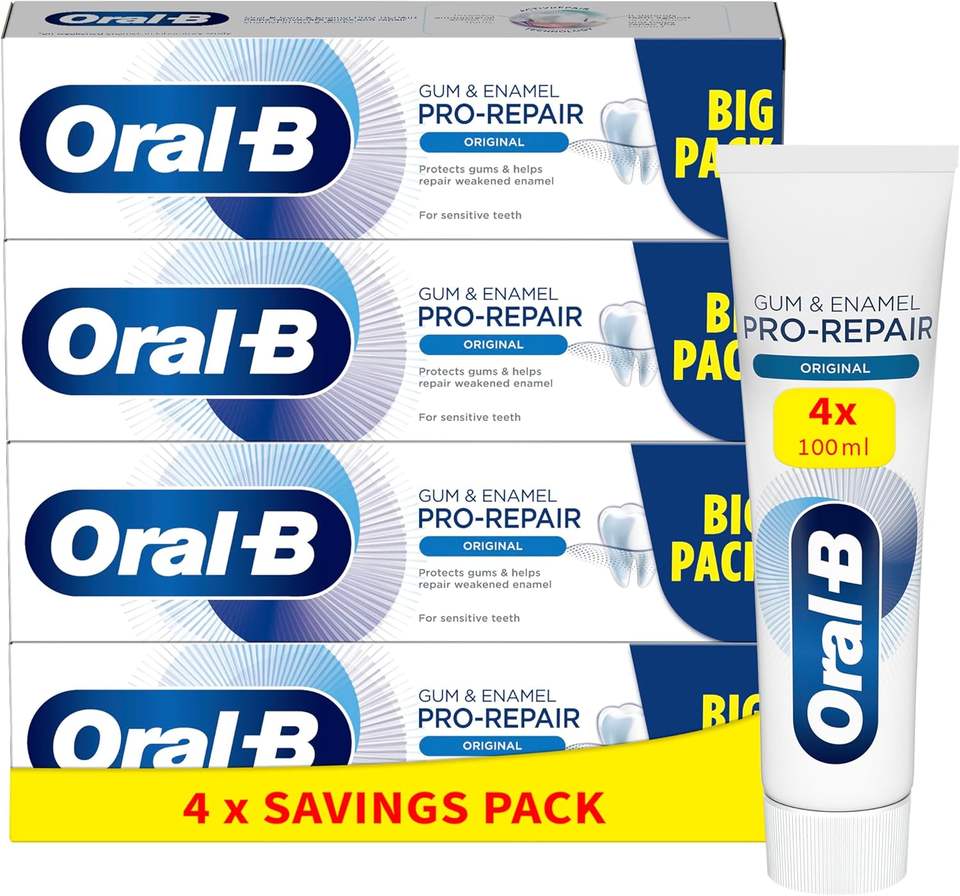 ยาสีฟันออรัล-บี โปร-รีแพร์ สูตรออริจินัล สำหรับเหงือกและเคลือบฟัน 400 มล. ในกล่องรีไซเคิลรักษ์โลก 100 มล. x 4 ชิ้น
