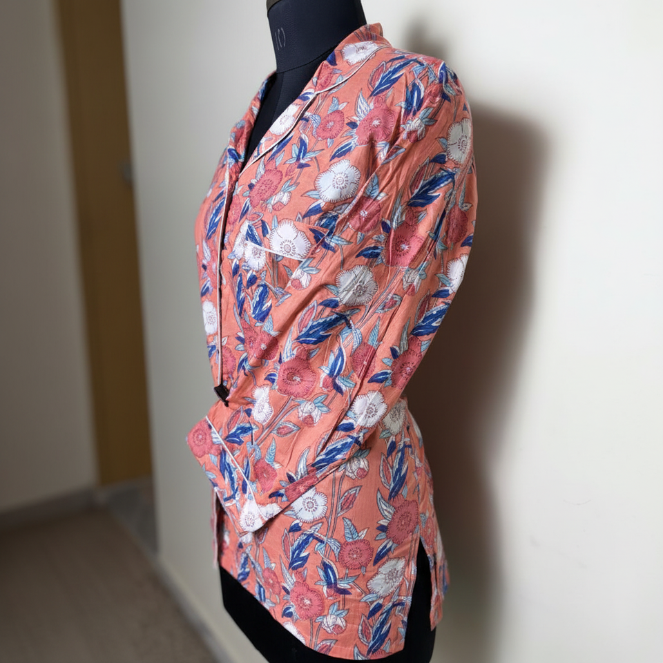 เสื้อลำลองผ้าฝ้ายของผู้หญิงลายดอกไม้สีชมพูปากพร้อมกระดุมตกแต่งคอผ้าทอเซ็กซี่สำหรับฤดูใบไม้ผลิฤดูร้อนฤดูใบไม้ร่วงฤดูหนาว