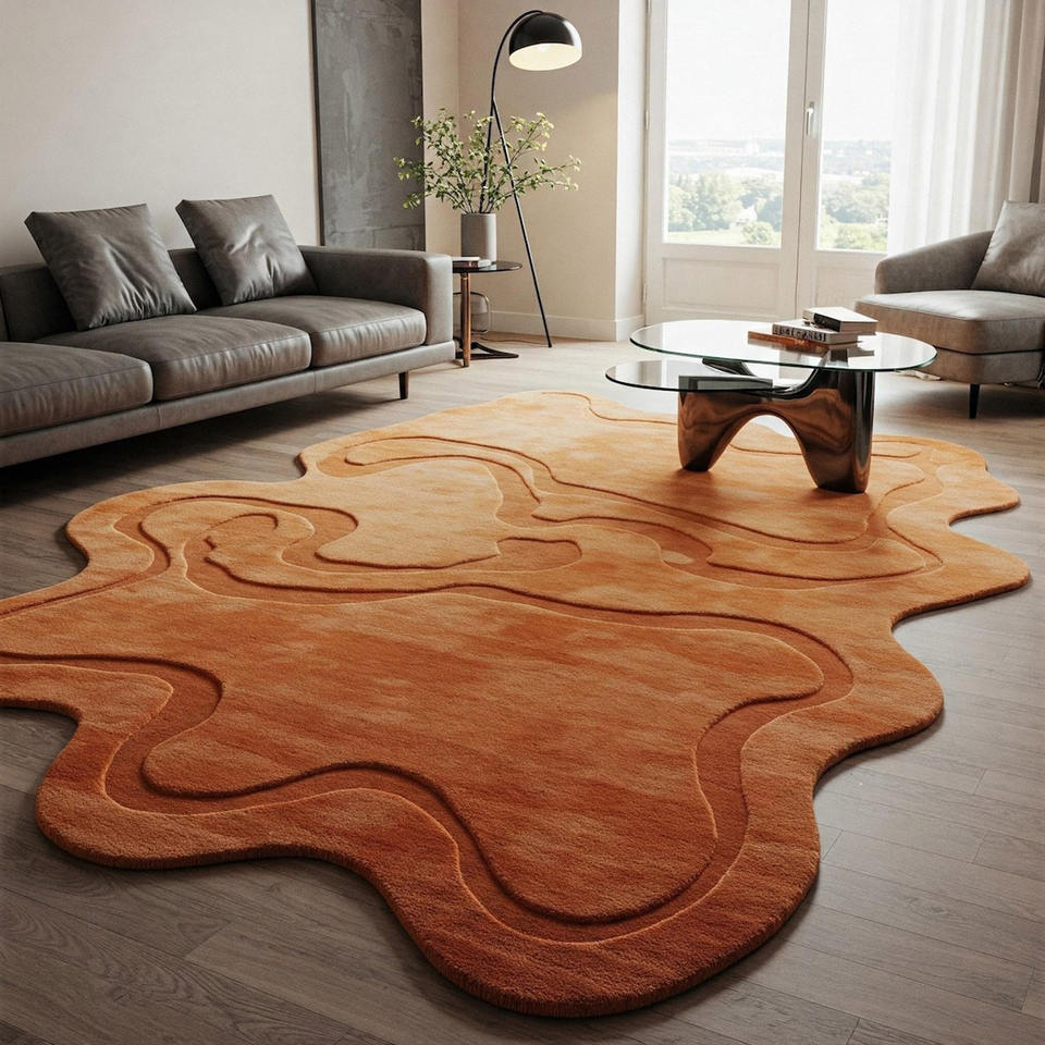 พรมขนสัตว์สีส้มลายนามธรรม ทำมือ รูปทรงไม่สม่ำเสมอ พรมปูพื้นทันสมัย ทอมือ ผลิตตามสั่งสำหรับห้องนั่งเล่น จากผู้ผลิตในอินเดีย