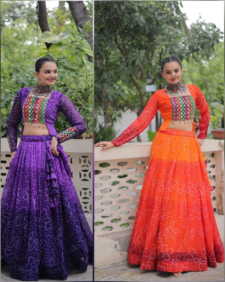 ชุดเลเฮนกาพิมพ์ลายบันดานีสีส้ม พร้อมงานปะติดคุชชี กัมธี และเสื้อคลุมเข้าชุด