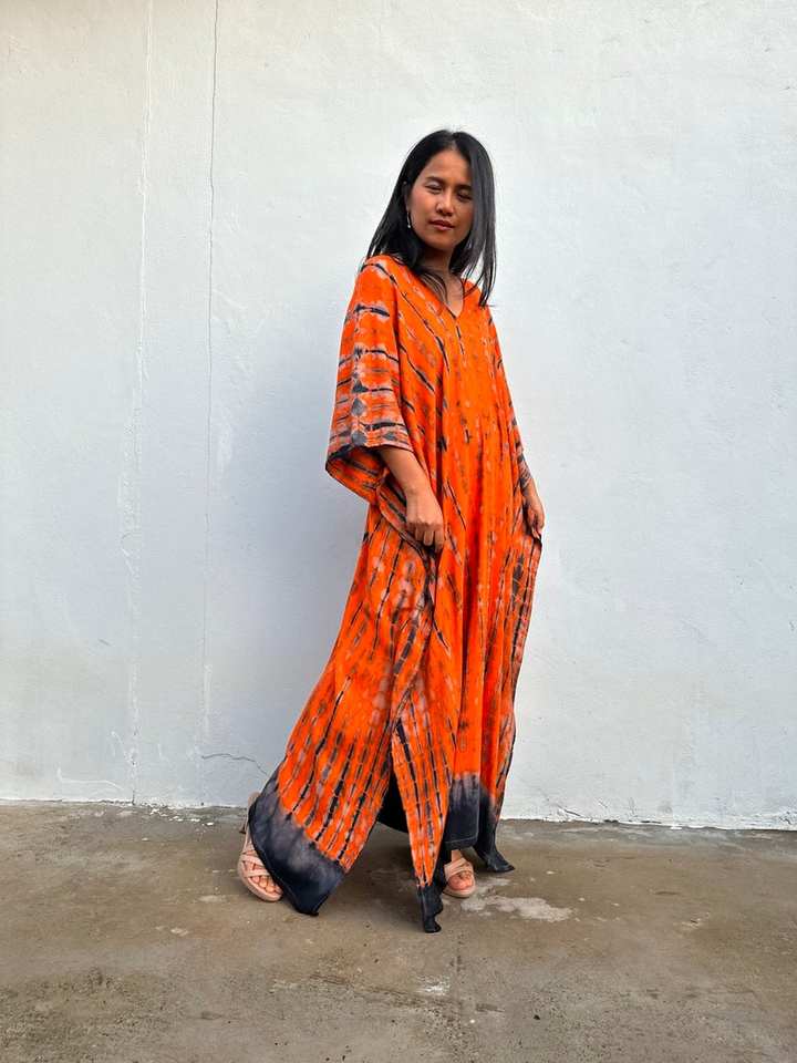ชุดคลุมคาฟตันสีส้มดำลายมัดย้อม สวมใส่สบาย เหมาะสำหรับชายหาด รีสอร์ท และพักผ่อน