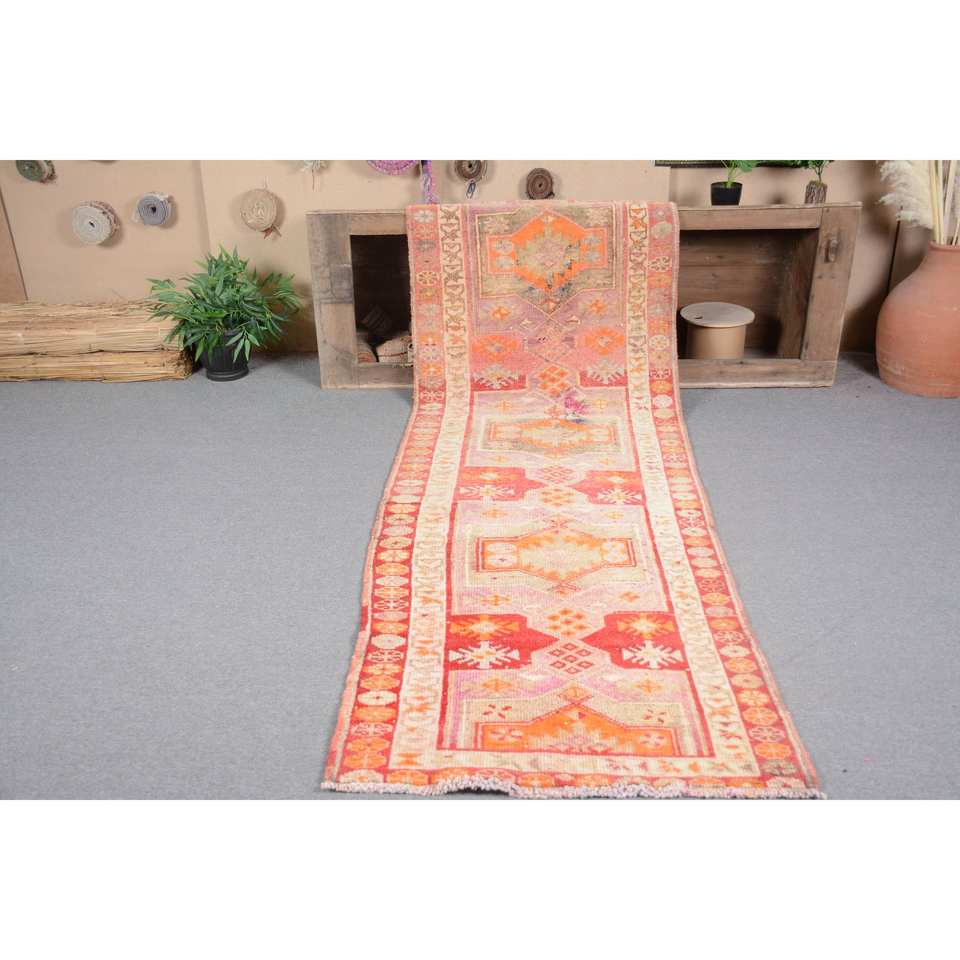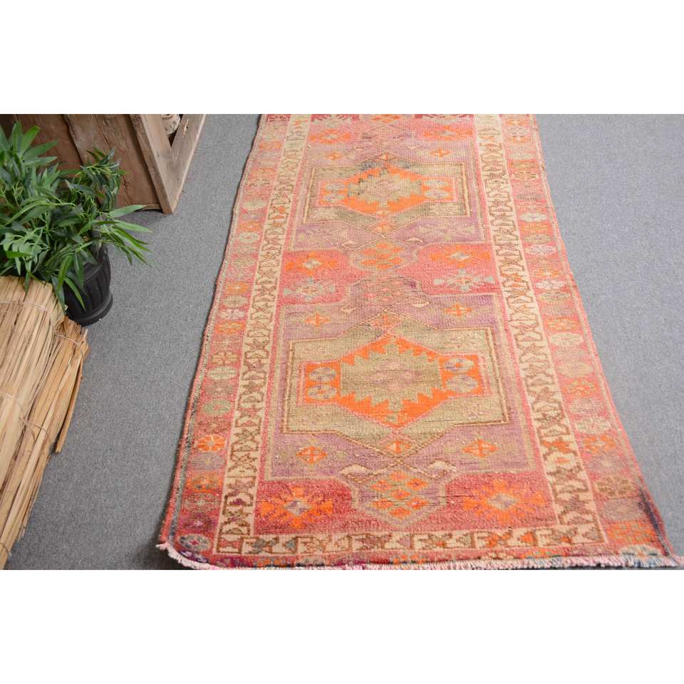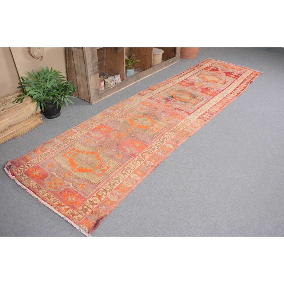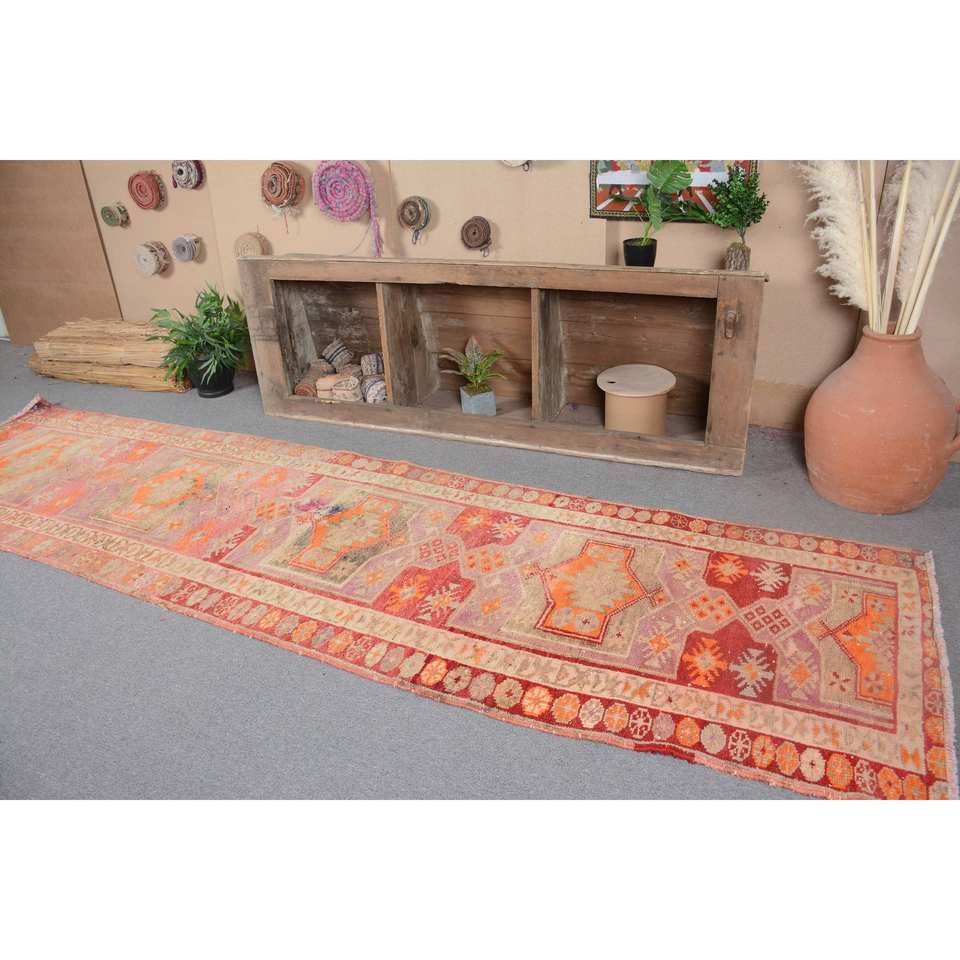 พรมตุรกีโบราณโบฮีเมียนสีส้ม-ขนาดกว้างขวาง2,9x11,2ฟุตคลาสสิกพื้นที่ขนาดใหญ่รูปสี่เหลี่ยมผืนผ้าการออกแบบการเย็บปะติดปะต่อกันวัสดุขนสัตว์ยาง4เมตร