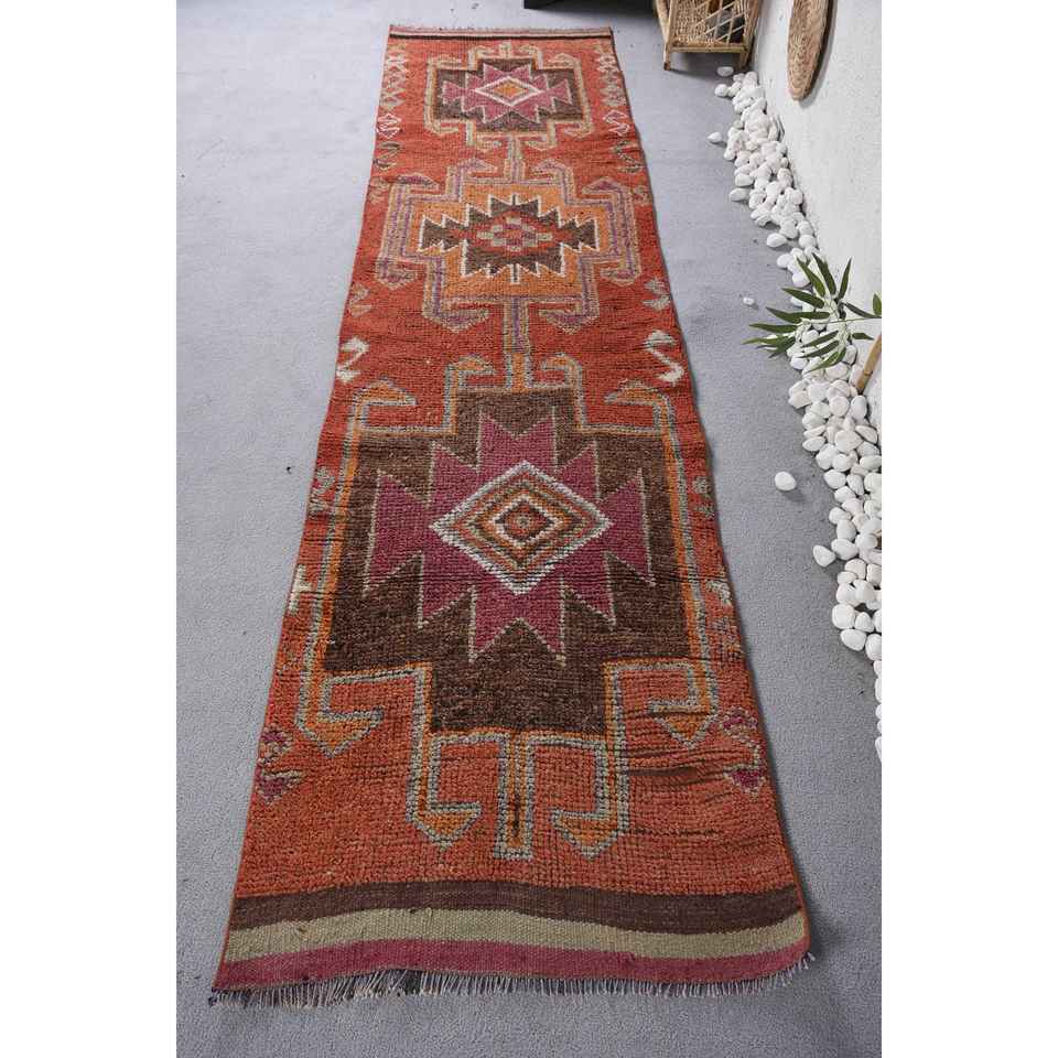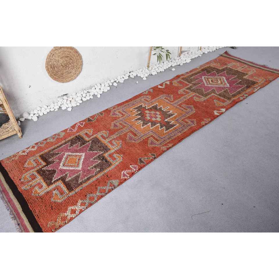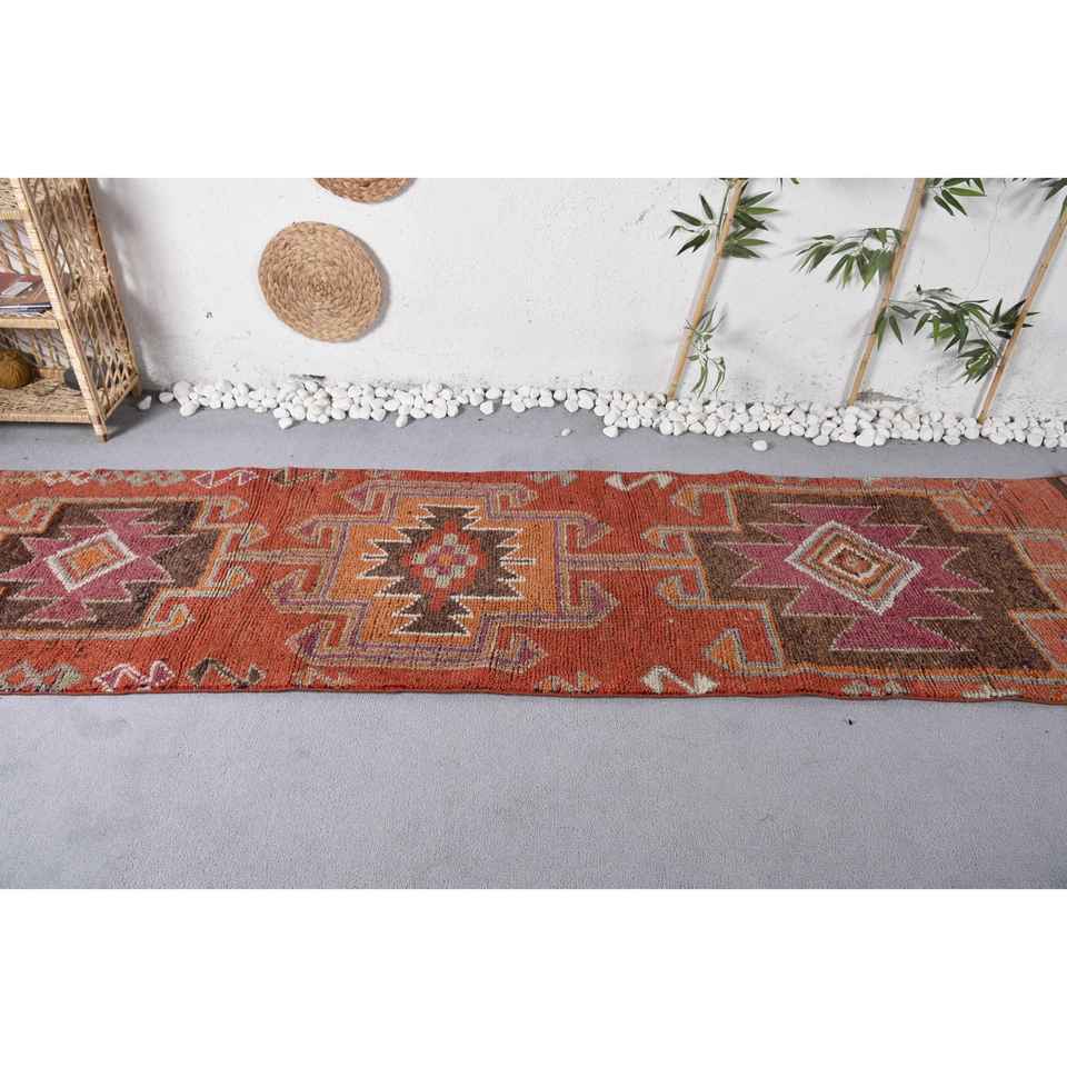 พรมตุรกีสไตล์โบฮีเมียนสีน้ำตาลส้ม วินเทจ ขนาด 2.7 x 10.4 ฟุต คลาสสิก ขนาดใหญ่ รูปทรงสี่เหลี่ยมผืนผ้า ลายปะติดปะต่อ ทำจากขนสัตว์และยางพารา เหมาะสำหรับห้องรับประทานอาหาร เป็นมิตรต่อสิ่งแวดล้อม