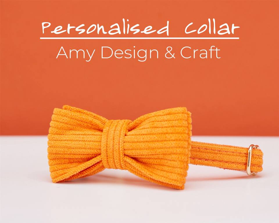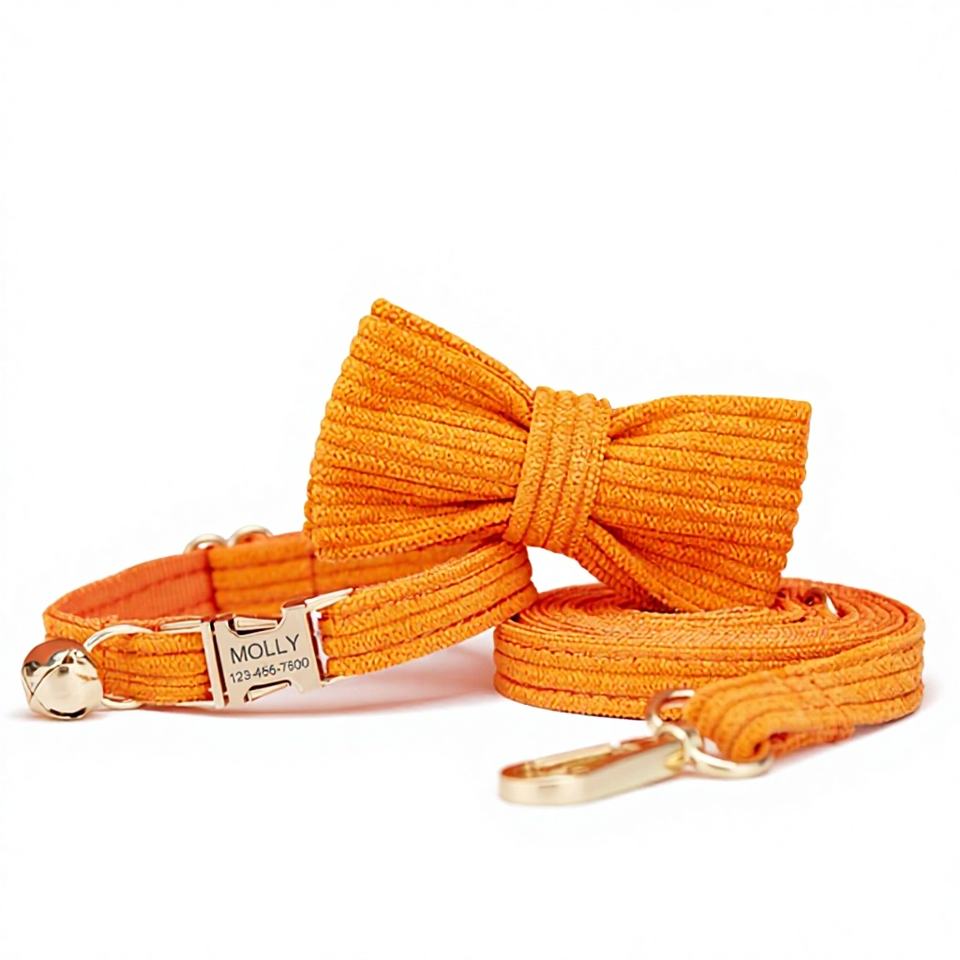 ชุดปลอกคอสุนัขและแมวขนาดเล็ก ผ้ากำมะหยี่สีส้ม พร้อมโบว์ผูก สายจูง และป้ายชื่อสลักชื่อฟรี พร้อมกระดิ่งทอง