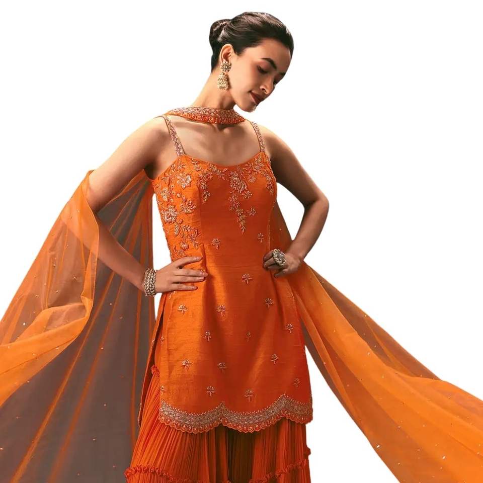 Kurti sharara ชุดผ้าไหมดิบสีส้มสำหรับผู้หญิงหรูหราสำหรับงานแต่งงานและงานเทศกาลชุดดีไซน์เนอร์