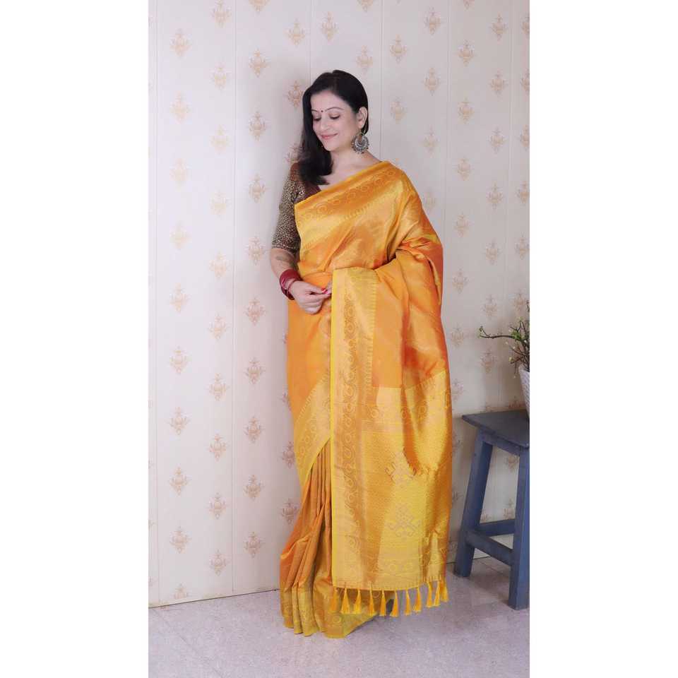 ผ้าไหมสีส้มเนื้อนุ่ม ลาย Bandhani Leheriya ทอแบบ Zari สำหรับชุดราตรีสุดหรู น้ำหนัก 650 กรัม