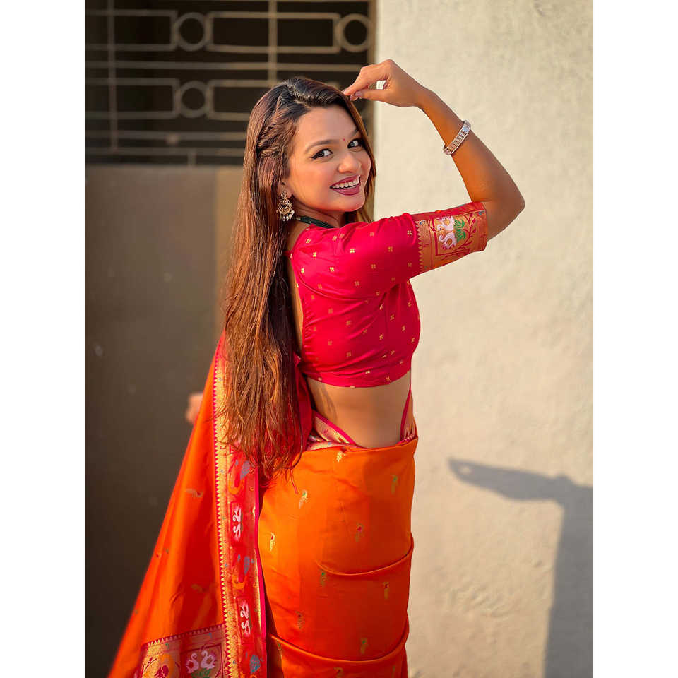 ผ้าไหมพิธานีสีส้มเนื้อนุ่ม โดย Elite Weaves น้ำหนัก 650 กรัม เสื้อผ้าอินเดียและปากีสถาน