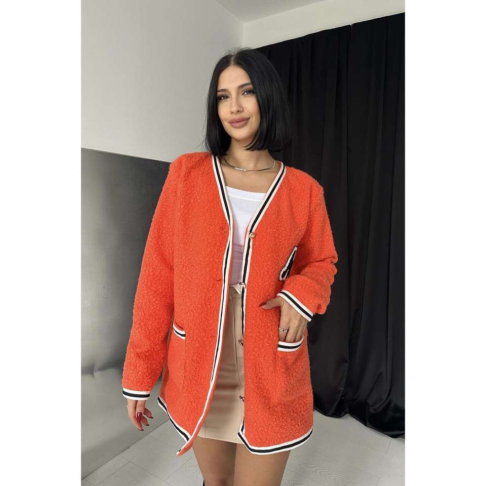 เสื้อคลุมคาร์ดิแกนไหมพรมสีส้มสำหรับผู้หญิง สไตล์ลำลอง สีตัดกัน ป้องกันขนร่วง แขนยาว