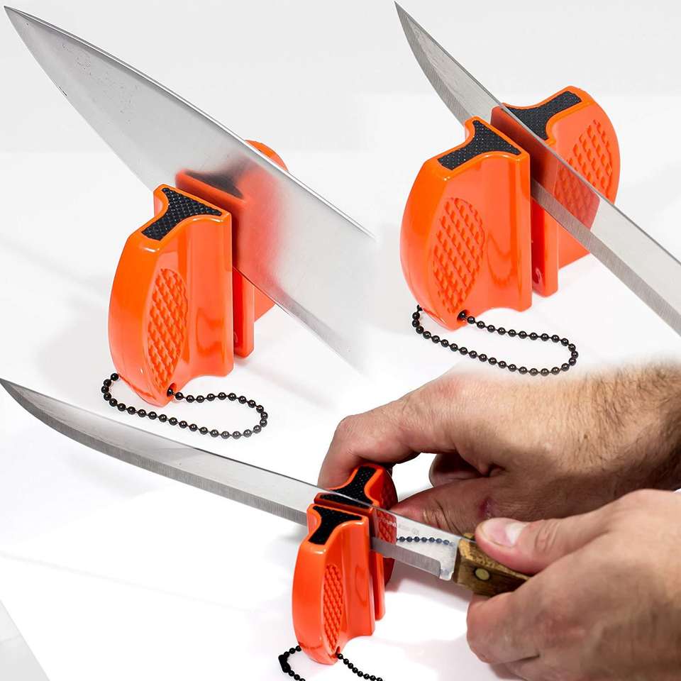 เครื่องลับมีดรูปตัววีสีส้ม พร้อมเซรามิกและทังสเตนคาร์ไบด์ สำหรับใช้งานกลางแจ้งและมีดทำครัว