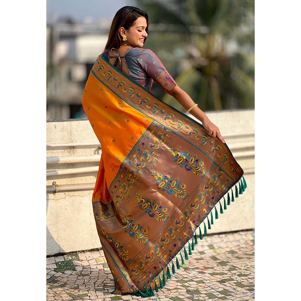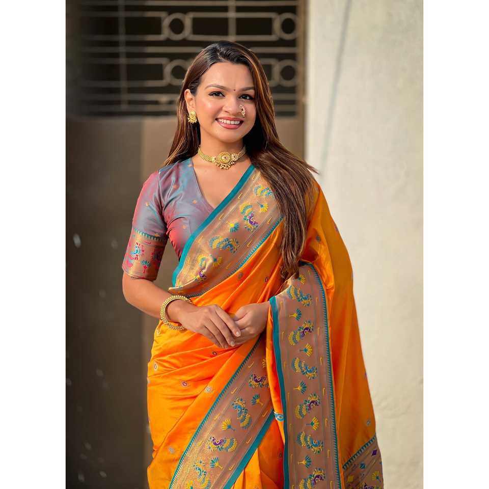 ผ้าไหมเยโอล่า ปาธาณี สีส้ม ลายซารี ทอแบบนาธ มีนาการี ตัดกัน ด้วยผ้าไหมอินเดียและปากีสถาน