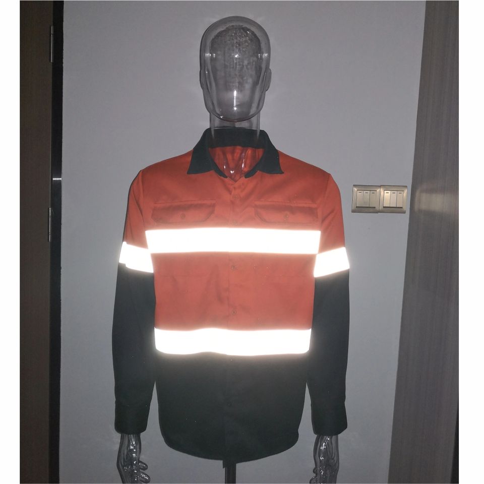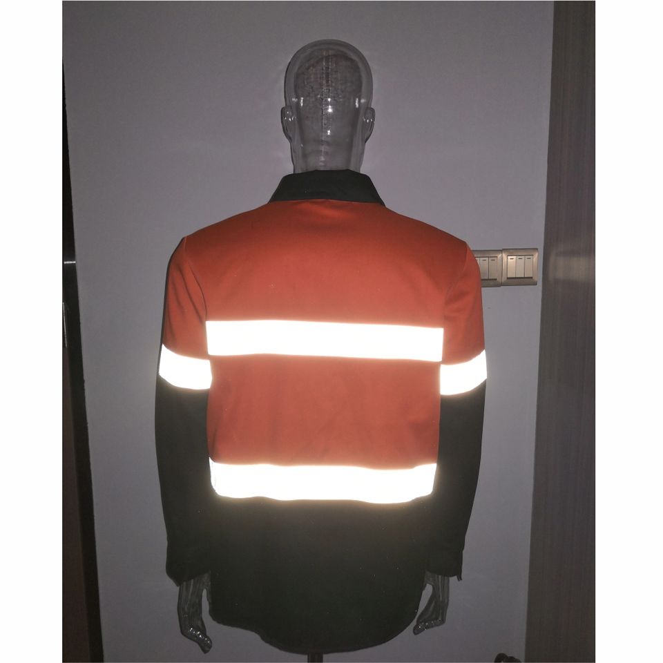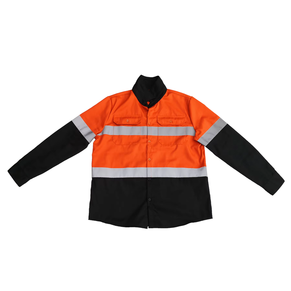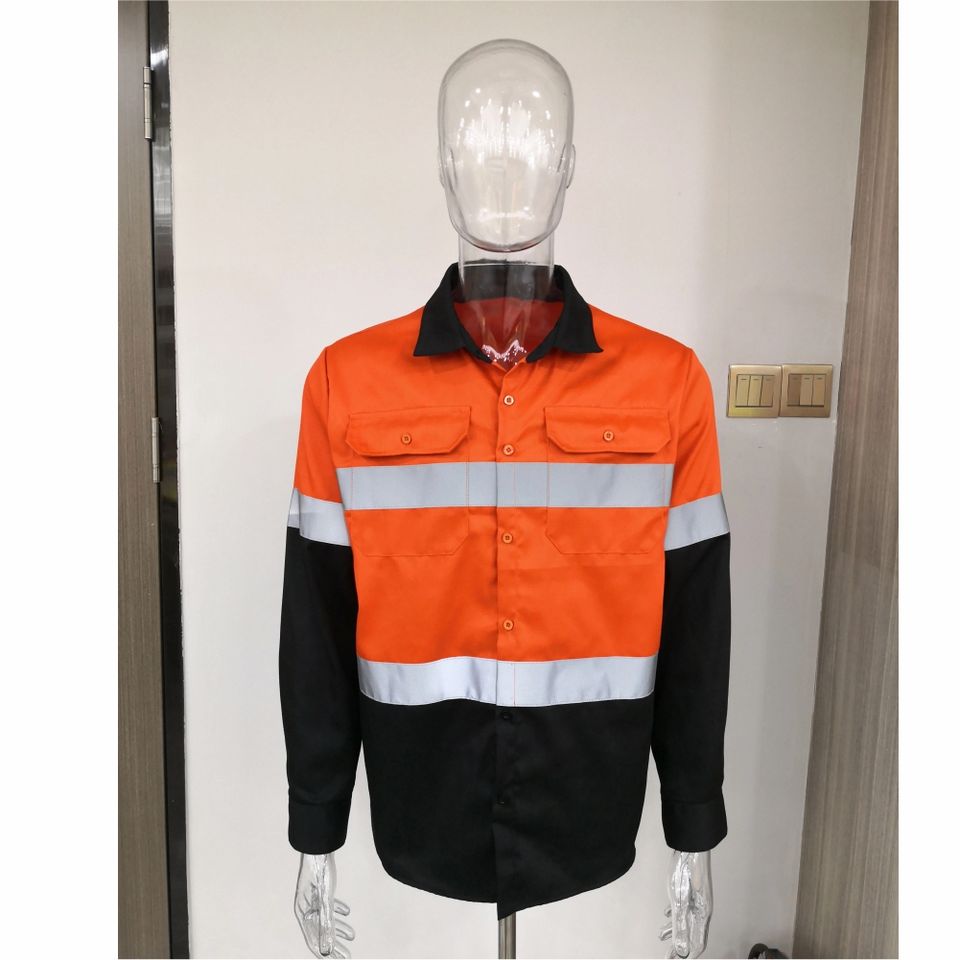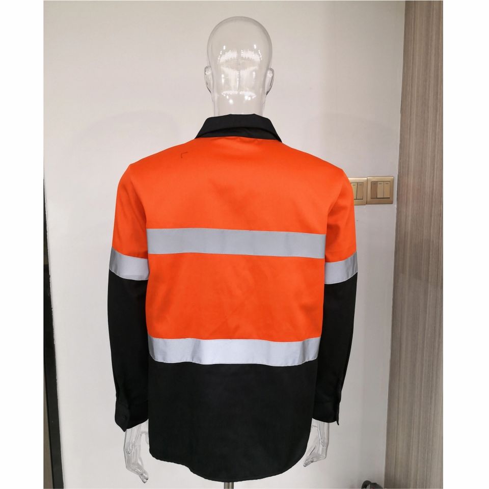 เสื้อผ้านิรภัยแบบเย็บสองสีชุดทำงานผ้าฝ้ายสีส้มและสีดำสะท้อนแสงปรับแต่งโลโก้ได้