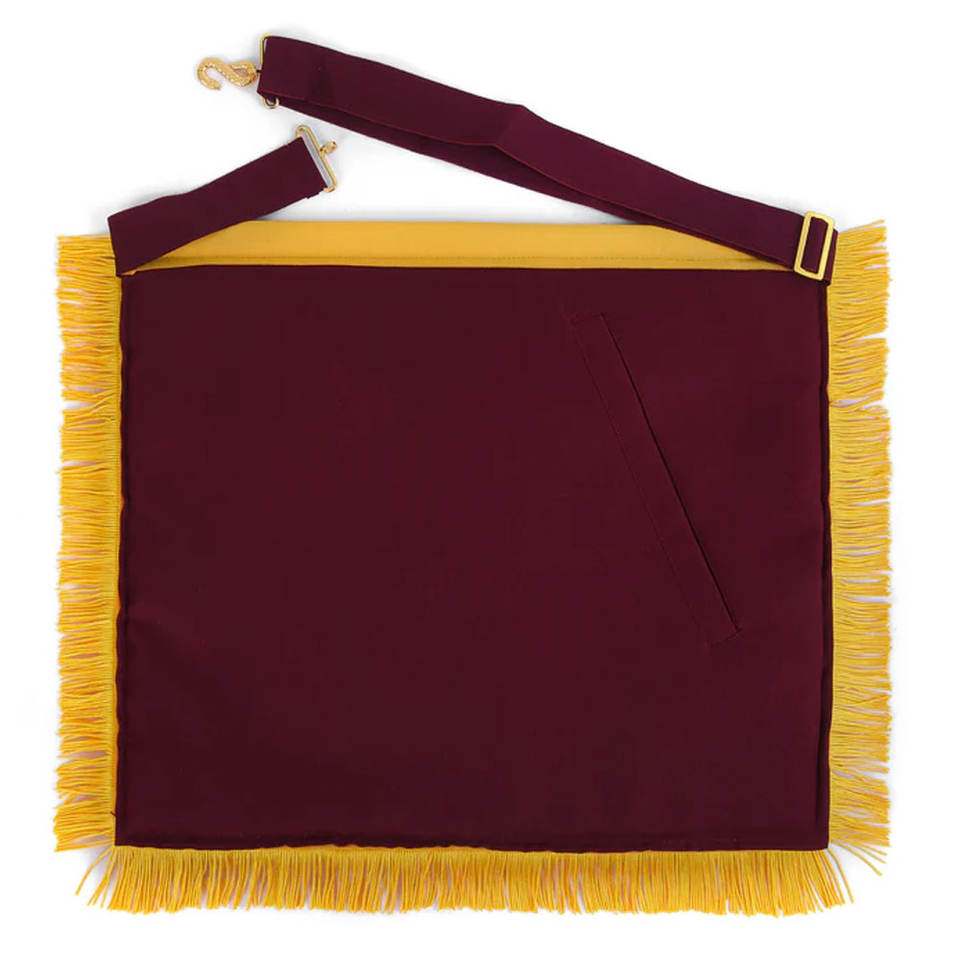 ผ้ากันเปื้อนเมสันสีแดงอมสีน้ำตาลทอง แต่งขอบสีเหลือง ปักลายละเอียด คุณภาพสูง รับผลิตตามสั่ง พร้อมปักโลโก้