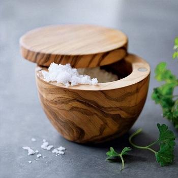 ภาชนะใส่เกลือทรงกลมทำจากไม้กระถินเทศออร์แกนิก พร้อมช้อน สำหรับใส่สมุนไพรและเครื่องเทศ ใช้ในบ้าน ใส่เกลือ พริกไทย หรือเครื่องเทศต่างๆ