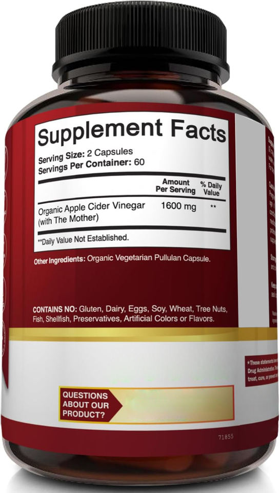 แคปซูลน้ำส้มสายชูหมักจากแอปเปิ้ลออร์แกนิกสำหรับผู้ใหญ่ ช่วยลดน้ำหนักและเสริมการย่อยอาหาร สูตรดีท็อกซ์สำหรับผู้ทานมังสวิรัติ 60 แคปซูล/ขวด