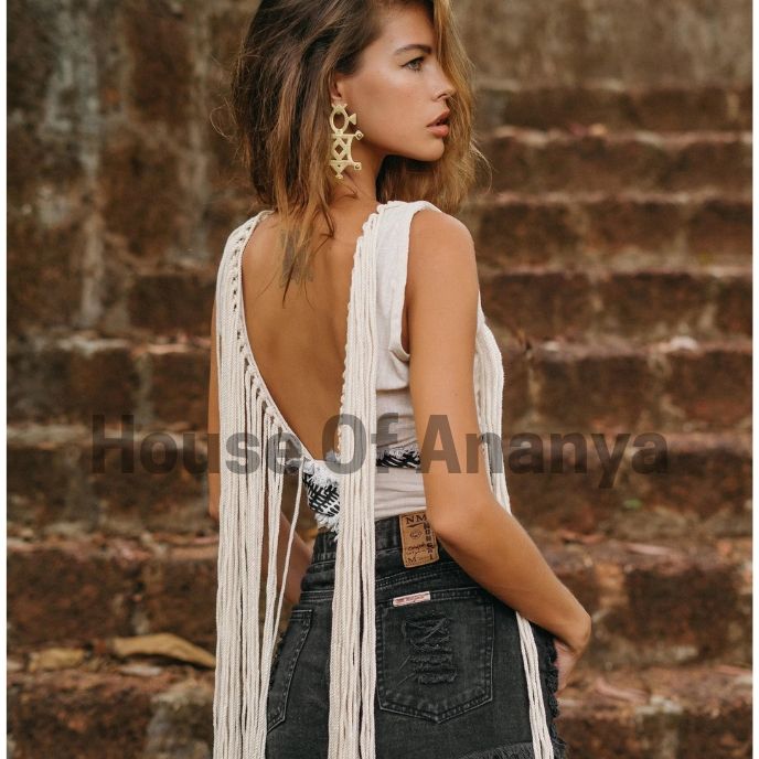 เสื้อครอปผ้าฝ้ายออร์แกนิกสไตล์โบโฮ เสื้อฮิปปี้สำหรับงานเทศกาล พร้อมสร้อยเชือกแบบมีพู่ เสื้อฤดูร้อนสไตล์โบฮีเมียน เสื้อผ้าโบโฮสำหรับผู้หญิง