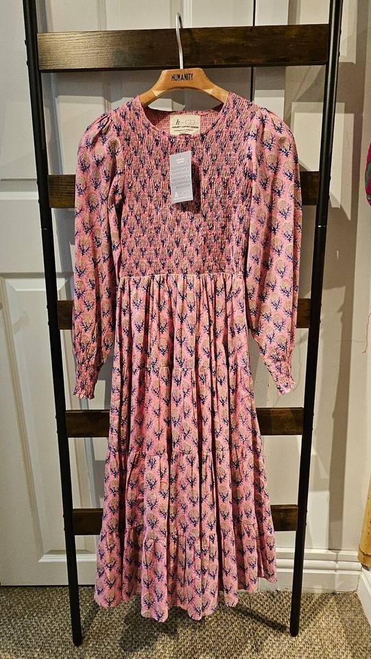 ชุดเดรสแม็กซี่ผ้าฝ้ายออร์แกนิคพิมพ์ลายบล็อกด้วยมือ ชายระบาย สไตล์โบฮีเมียนสำหรับผู้หญิง