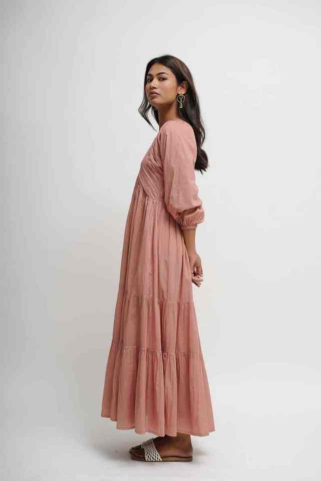 เดรสแม็กซี่สีชมพูผ้าฝ้ายออร์แกนิคโบฮีเมียนสไตล์หวานๆแบบชั้นๆแต่งลูกไม้แบบหลวมปรับขนาดได้