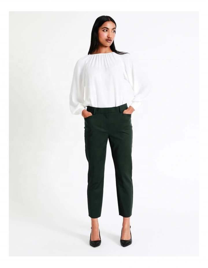 กางเกงผ้าต่วนจากผ้าฝ้ายออร์แกนิกสีเขียวของป่าพร้อมทรงสลิมฟิตและเอวสูงปานกลางกางเกงเหล่านี้มีการออกแบบที่ซับซ้อนมีซิปบินเข้ามาใกล้