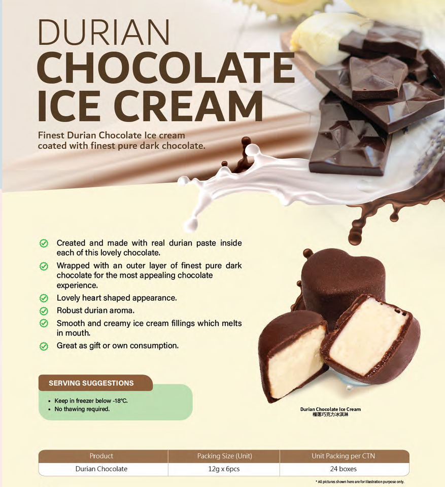 ไอศกรีมช็อกโกแลตทุเรียนออร์แกนิกแบบแท่งแช่แข็ง IQF บรรจุภัณฑ์สุญญากาศแบบกล่อง จากผู้ผลิตมาเลเซียโดยตรง