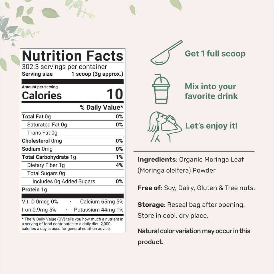 ผงใบมะรุมออร์แกนิก 2 ปอนด์ สารต้านอนุมูลอิสระ วิตามินเสริมภูมิคุ้มกัน ใบบริสุทธิ์ไม่มีก้าน ซูเปอร์ฟู้ดสำหรับชงชาหรือดื่ม