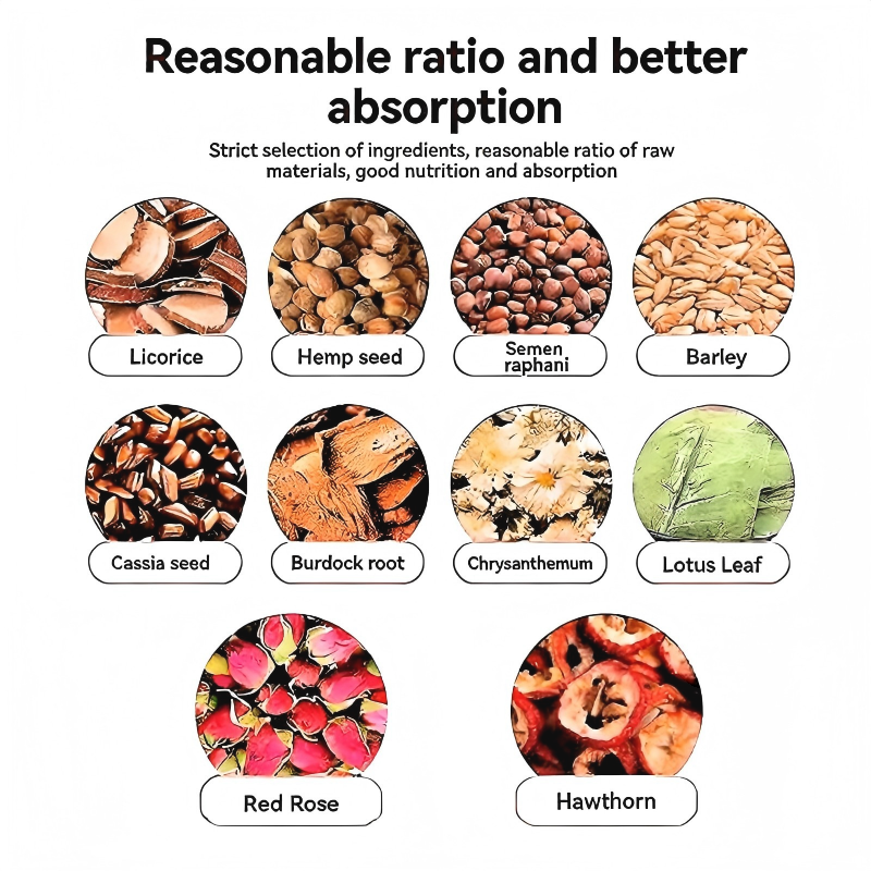 ส่วนผสม:รากชะเอมเทศ, ข้าวบาร์เลย์, ดอกเบญจมาศ, เมล็ดชุมเห็ดเทศ