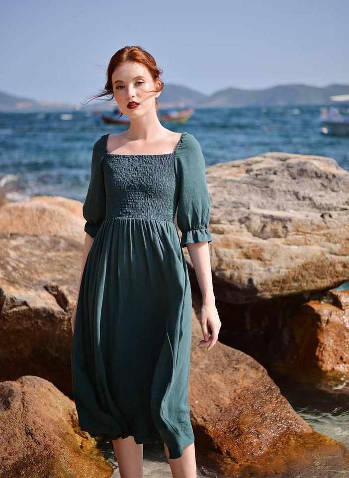 ชุดเดรสมิดิผ้าลินินออร์แกนิกสำหรับผู้หญิงเสื้อผ้าฤดูร้อนซักได้ดีไซน์เปิดไหล่ลายดอกไม้สวมใส่สบายและมีสไตล์