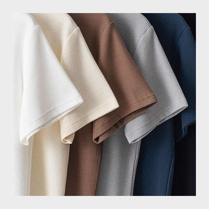 เสื้อยืดถักวาฟเฟิลออแกนิคสำหรับผู้ชายเสื้อยืดผ้าโพลีเอสเตอร์/ ผ้าฝ้ายแบบบางระบายอากาศเป็นมิตรต่อสิ่งแวดล้อม
