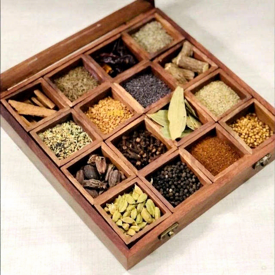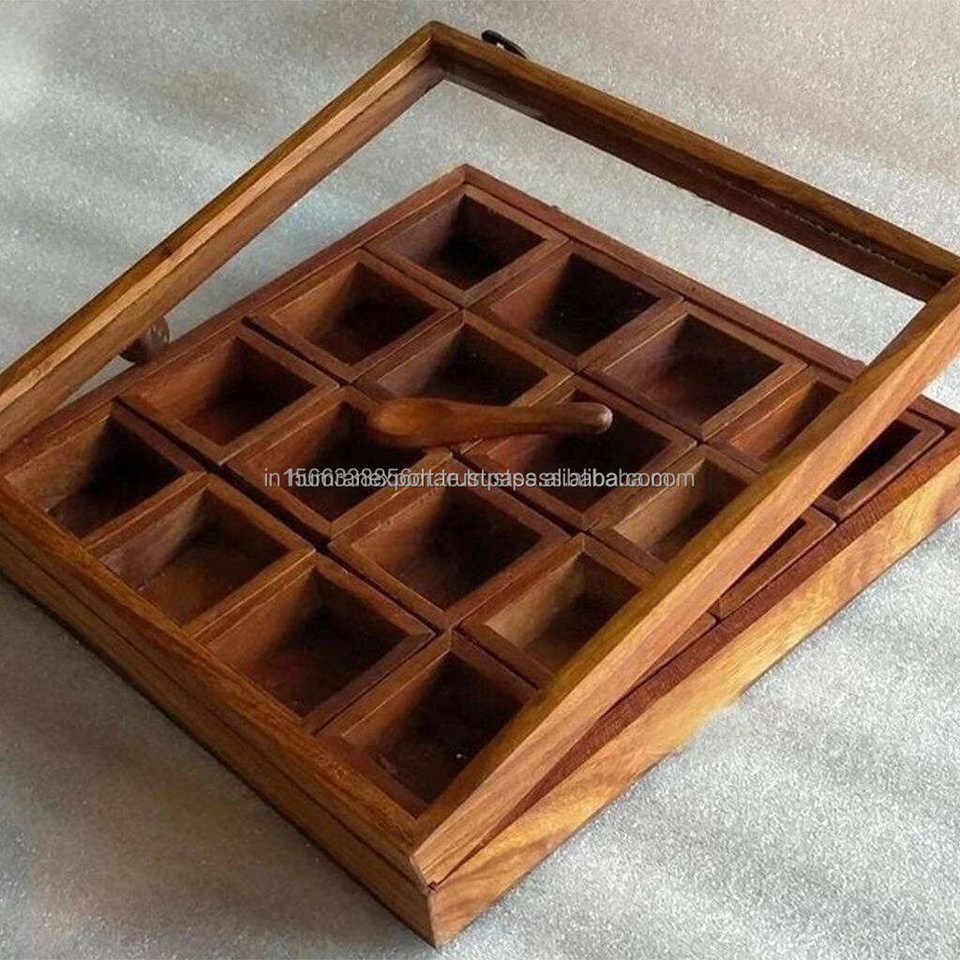 กล่องเก็บช็อกโกแลตและเครื่องเทศสไตล์ไม้ สีน้ำตาลทูโทน ทำด้วยมือ พร้อมช่องใส่ของ 16 ช่อง และช้อน