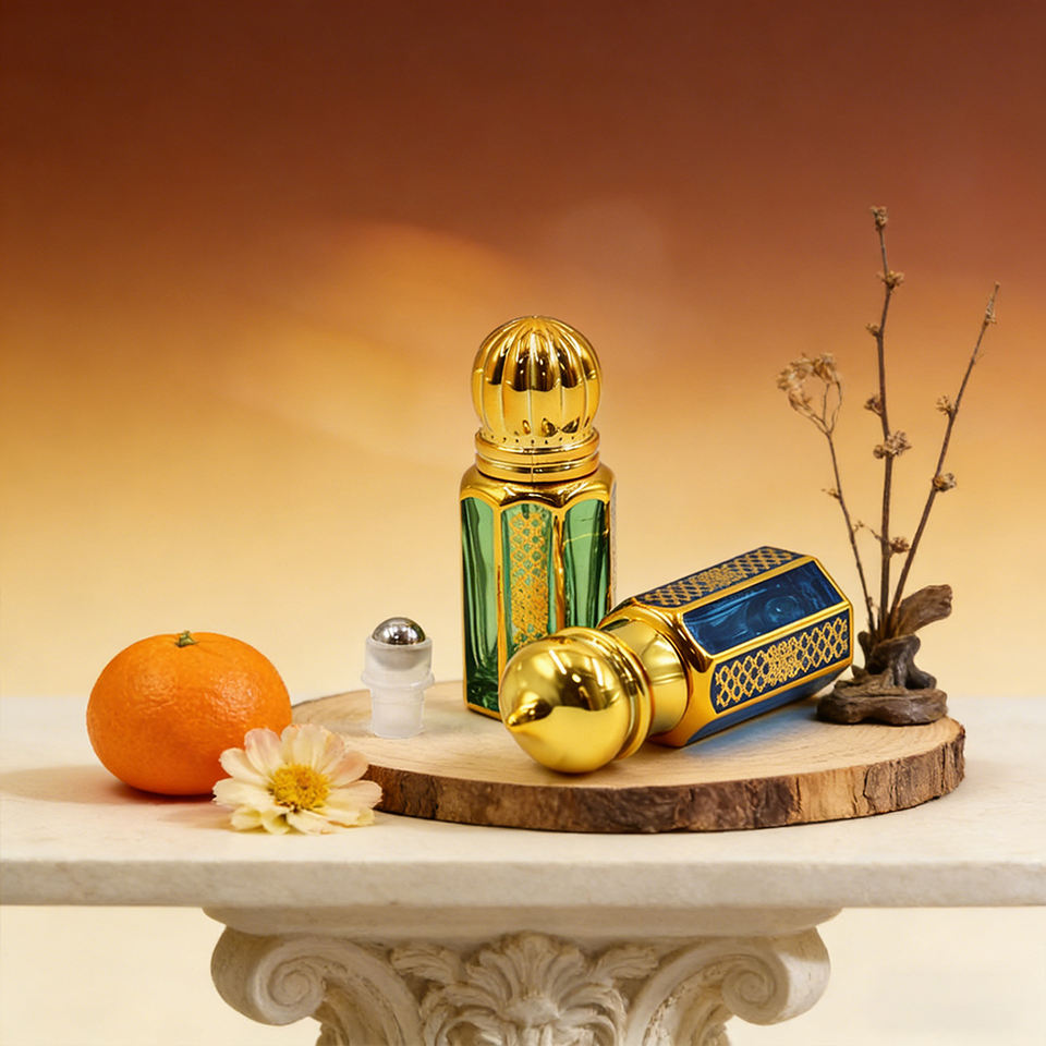 ขวดแก้วโรลออนลายอาร์ตเดโคแบบตะวันออก ขนาด 3 มล. 6 มล. 10 มล. 12 มล. ฝาครอบมงกุฎทองหรูหราสำหรับน้ำมันบำรุงผิวและน้ำหอม