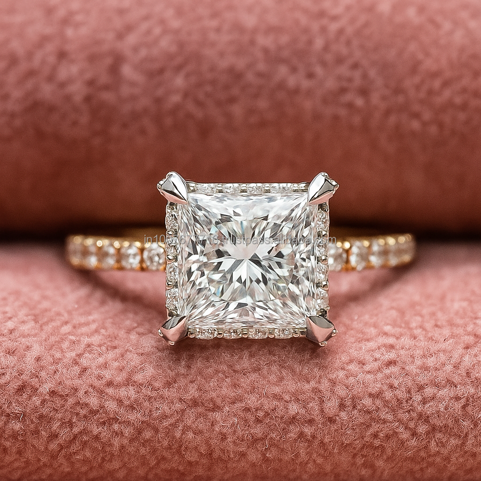 แหวนหมั้นเพชรโมอีสแบบครึ่ง2.00CT ของแท้สำหรับเจ้าหญิงตัดแบบครึ่งนิรันดร์แหวนทอง14K แข็งสีเหลืองทองหรูหราเครื่องประดับรัศมีที่ซ่อนอยู่