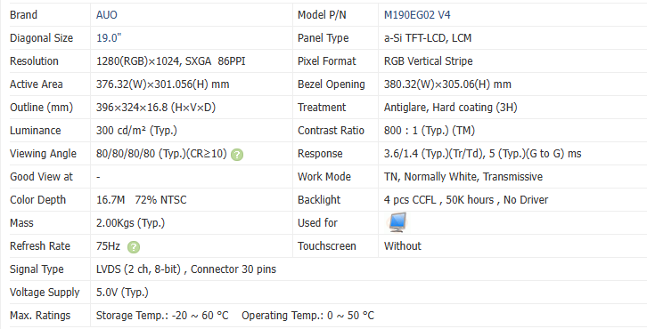 โมดูลจอ LCD รุ่น Original AUO M190EG02 V4 ขนาด 19 นิ้ว ความละเอียด 1280×1024 SXGA ความสว่าง 300cd/m² สำหรับเปลี่ยนในคอมพิวเตอร์อุตสาหกรรมแบบออลอินวัน