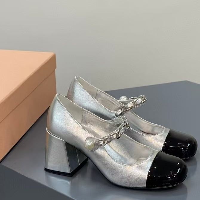 รองเท้าส้นสูงแบบแมรี่เจนสีดำขาวสไตล์คลาสสิคดั้งเดิมของ MIU ดีไซน์สายรัดเส้นเดียวแบบต่อผ้า สำหรับผู้หญิง