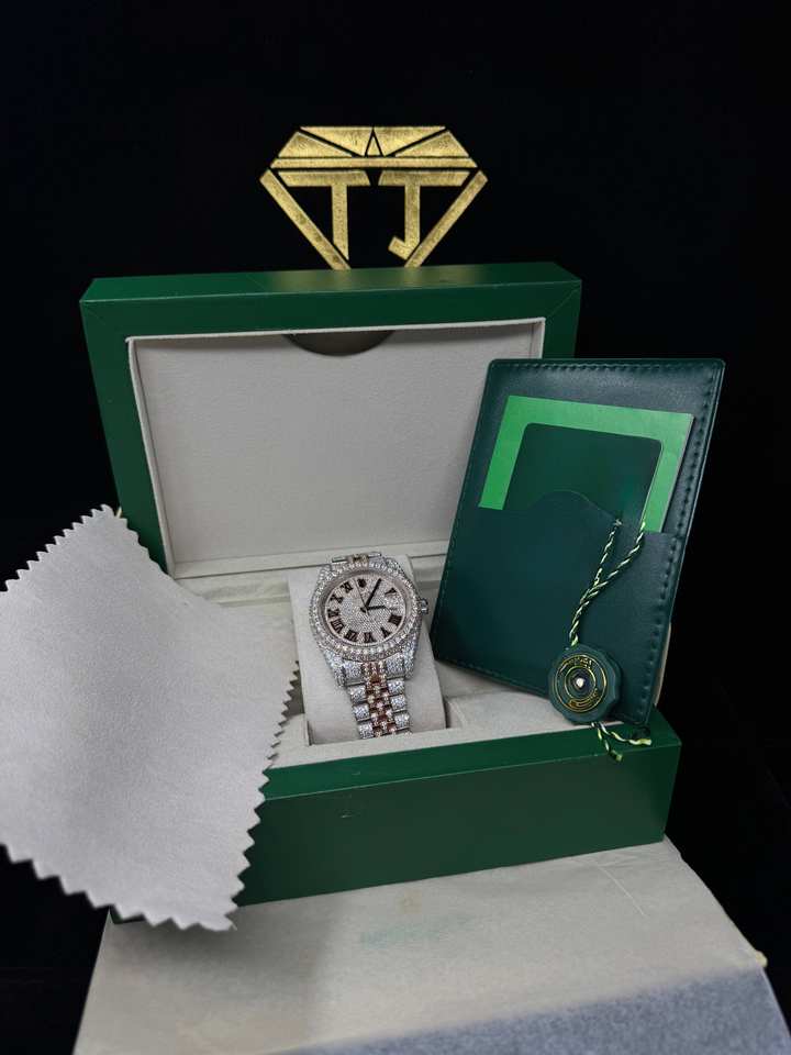 นาฬิกาเพชรสไตล์ฮิปฮอปโมอิสซาไนท์หรูหราแบบดั้งเดิมออกแบบได้เองกรอบหมายเลขโรมันสีเขียวเทาสแตนเลสสตีลพรีเมียม