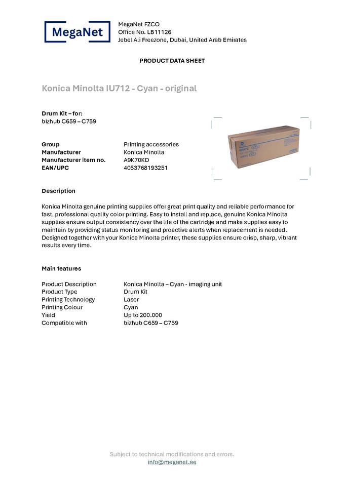 ชุดภาพถ่าย (Imaging Unit) ของแท้ ยี่ห้อ Konica Minolta รุ่น IU712C - A9K70KD ของใหม่ สำหรับเครื่อง Bizhub C659 / C759