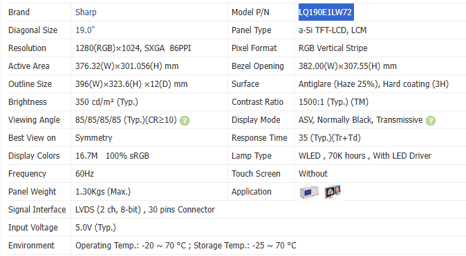 Original LQ190E1LW72 19 inch TFT LCD Module Industrial Grade Display for Medical and HMI Equipment with OEM Support