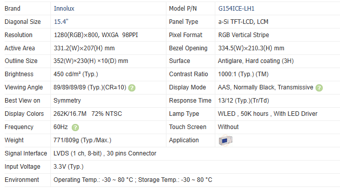 โมดูลจอ LCD อุตสาหกรรม Innolux ของแท้ ขนาด 15.4 นิ้ว ความละเอียด 1280*800 ความสว่าง 450nits จอแสดงผล TFT สำหรับใช้งานในอุตสาหกรรม