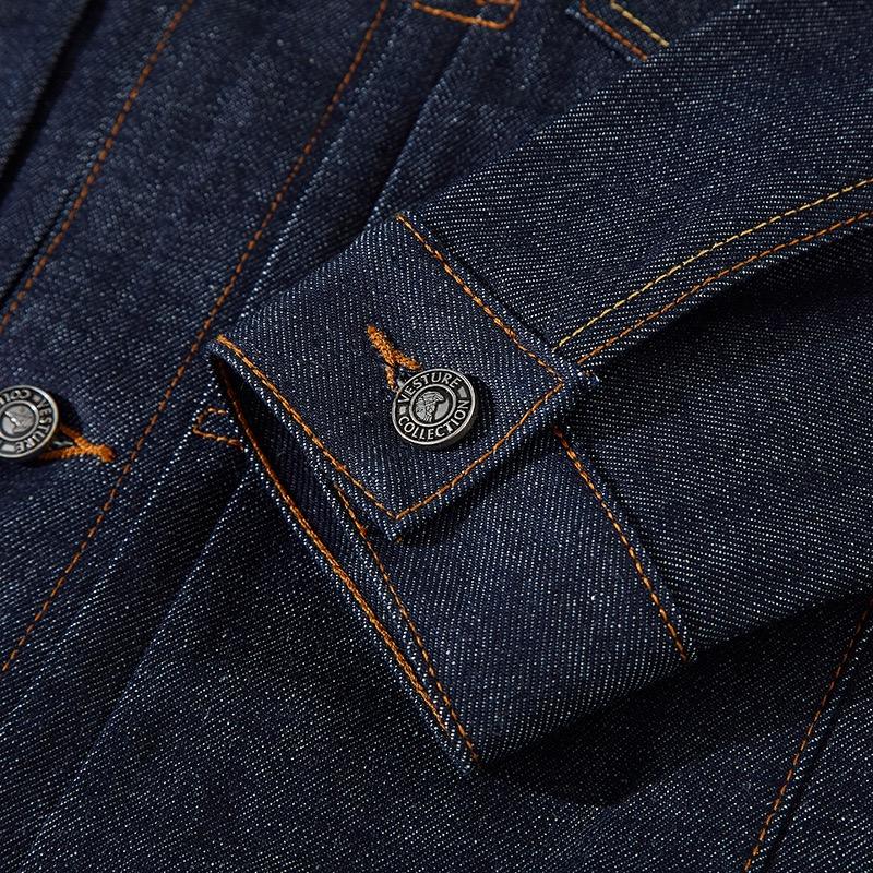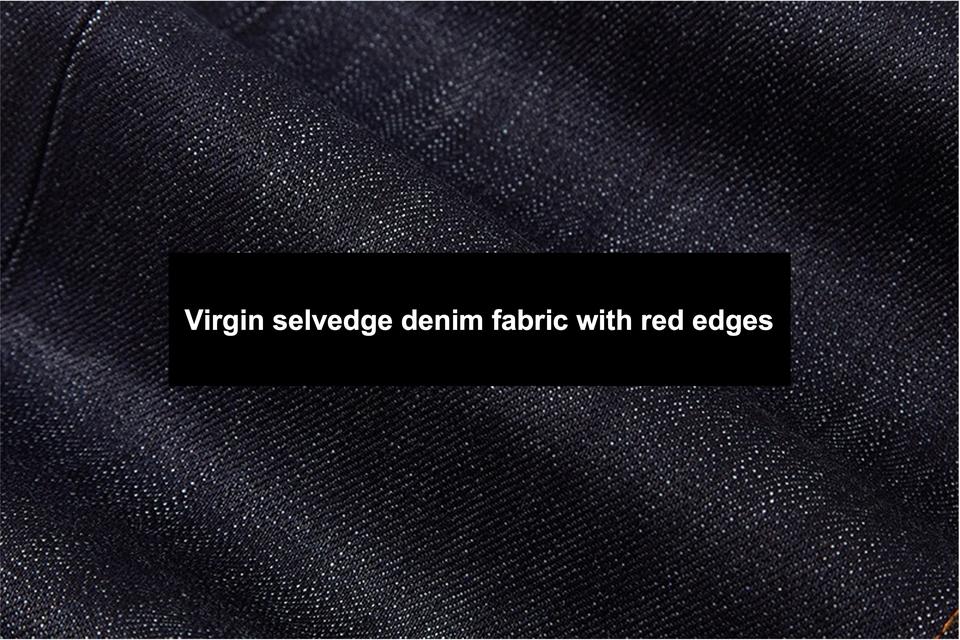 แจ็กเก็ตใส่ทำงานผ้ายีนส์สีแดงเข้มแบบดั้งเดิมสำหรับผู้ชายสไตล์วินเทจแบบลำลองอเมริกันกับเสื้อโค้ทผู้ชายสีฟ้าเข้มแบบญี่ปุ่น