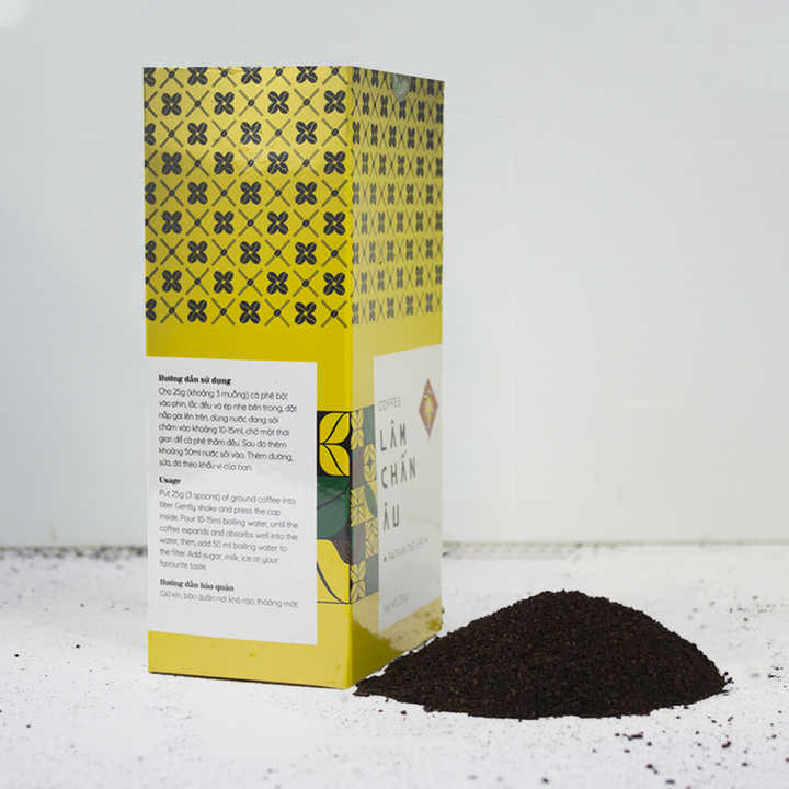กล่องสีเหลืองบดรสชาติกลมกล่อมผงกาแฟที่มีคาเฟอีนมีต้นกำเนิดมาจากประเทศเวียดนามสำหรับน้ำเดือด